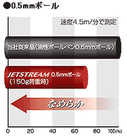 三菱鉛筆の既存油性ボールペンと比較して、従来よりも筆記摩擦比を軽減。