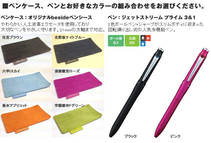 三菱 ジェットストリーム プライム 多機能ペン 3&1サイズ:全長約138mm軸径:直径約11.7mm重量:約57.6g3&1:ボールペン0.7mm 黒・赤・青+シャープ0.5mm回転式カラー:ブラック/ピンク beside ペンシース素材:エクセーヌ径:21mmまで対応サイズ:約80X150X21 mm重さ:18g生産国:日本カラー:学園都市フレッシュグリーン(黄緑)/垂水アプリコット(オレンジ)/須磨離宮ローズ(ピンク)/六甲アイランドスカイ(水色)/北野坂ナイトブルー(紺)/住吉ブラウン(茶)   KEYWORD プレゼント / お祝い / セット / ジェットストリーム / 多機ペン / ボールペン / シャーペン / 万年筆 / 入れ物 / おしゃれ / かっこいい / かわいい / グリーン / 緑 / ブルー / 青 / 水色 / ブラウン / 茶色 / 茶 / ローズ / ピンク / オレンジ