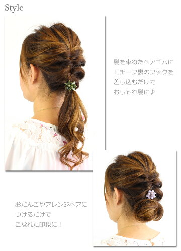商品説明 使い方は髪を束ねたヘアゴムにモチーフ裏のフックをひっかけるだけ!! いままでのモチーフつきヘアゴムですとモチーフの位置や向きが思ったように決まらなかったり、 ゴムが伸びてしまって使えなくなってしまったりと。
