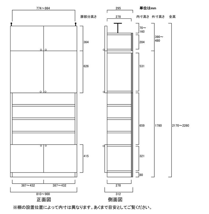 耐震突っ張りラック高さ217〜226cm幅81〜90cm奥行31cm厚棚板(棚板厚2.5cm) 本体棚扉サイズ:上扉62.6cm+下扉41.5cm(高さ=ラック高さ178cm+突張棚高さ32cm+伸縮突張金具)飾り棚付両開き扉耐震突っ張りラック